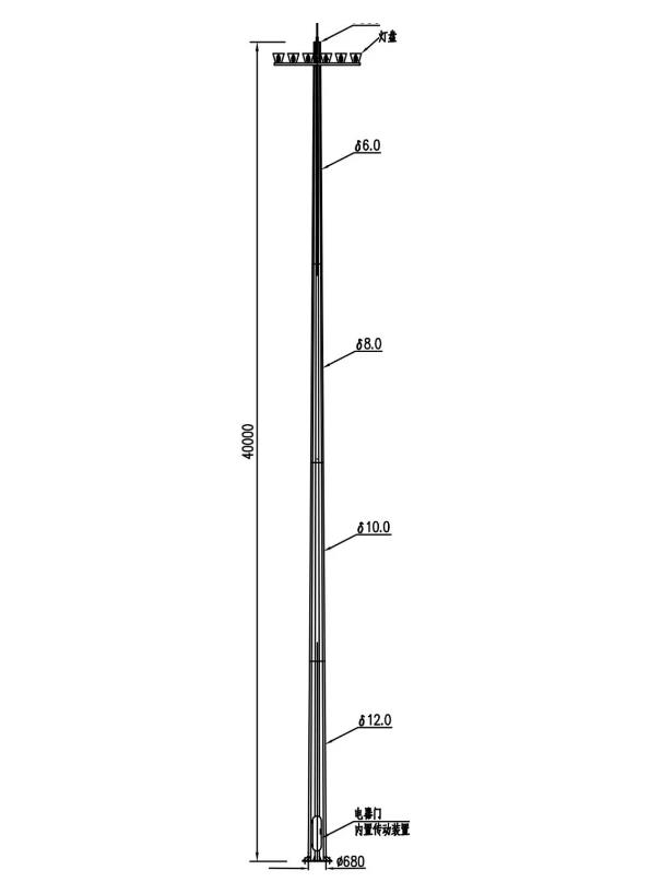 燈具由燈桿燈盤,升降系統(tǒng),配電系統(tǒng),基礎(chǔ),避雷裝置等組成。外觀以功能型為主,整體造型美觀、大方。操作方便,易于維修。
